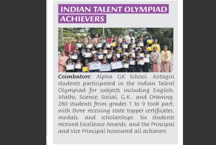 State Toppers received certificate and cash prize from Indian Talent Olympiad.